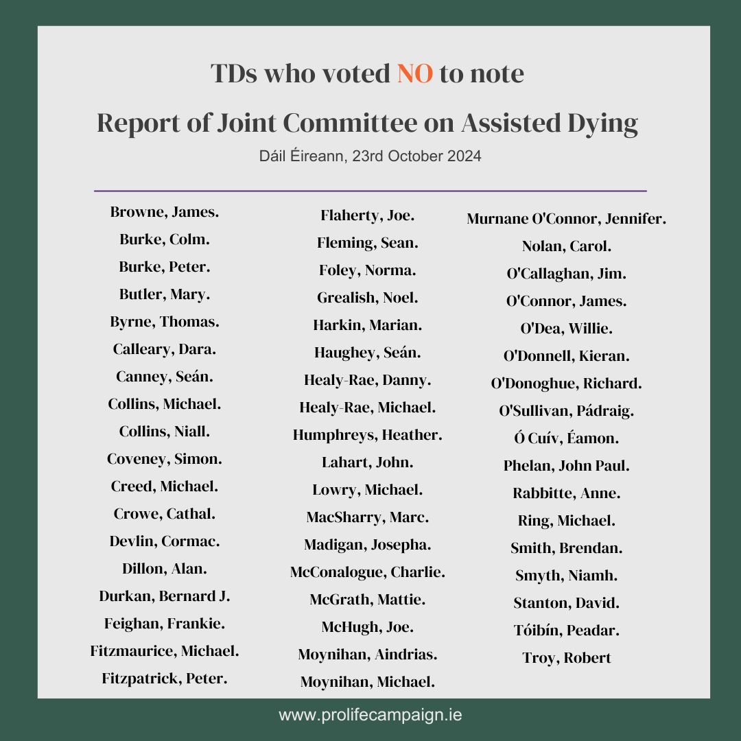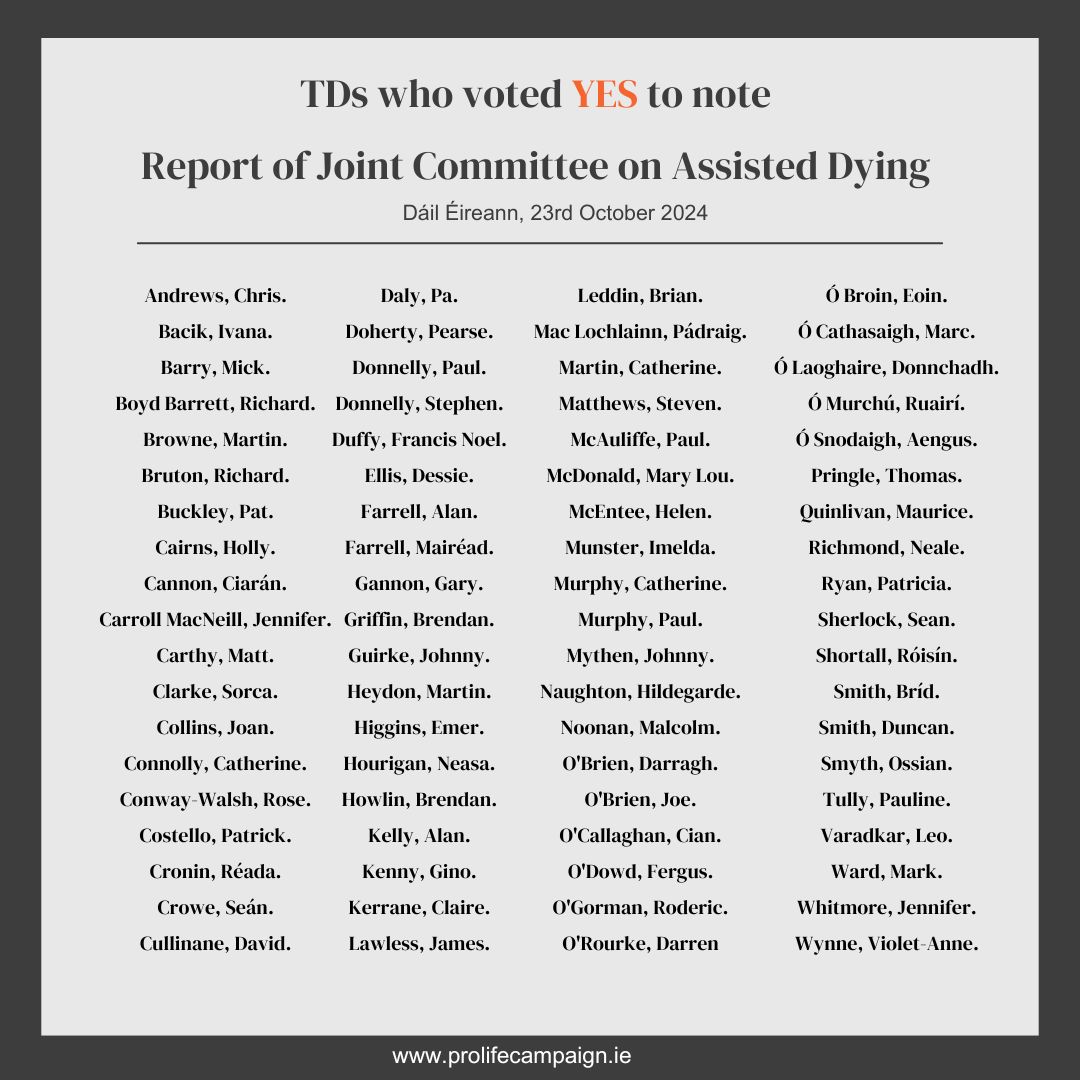 Credit to the 53 TDs who voted No on Wednesday evening! They understand the seriousness of the issue and how extreme and far-reaching the recommendations of the Joint Committee on Assisted Dying are, and the type of life-ending regime it would usher in if given effect in law.